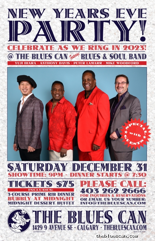 | Description: | 9pm showtime: Presenting THE BLUES & SOUL BAND with Special Guests for your NYE entertainment and dancing! All included in price: 3 course Prime Rib Dinner, bubbly at midnight, door prizes and a midnight Dessert Buffet! 9pm showtime. $75. We always sell out for NYE, so don't wait too long to get your tickets! Come on out for a great time Blues-Canners! Please call 403-262-2666 to make your Reservations! Or email us your number: info@thebluescan.com We 💖 you Blues-Canners! Thank you for your continued support of us and live-music in YYC! |